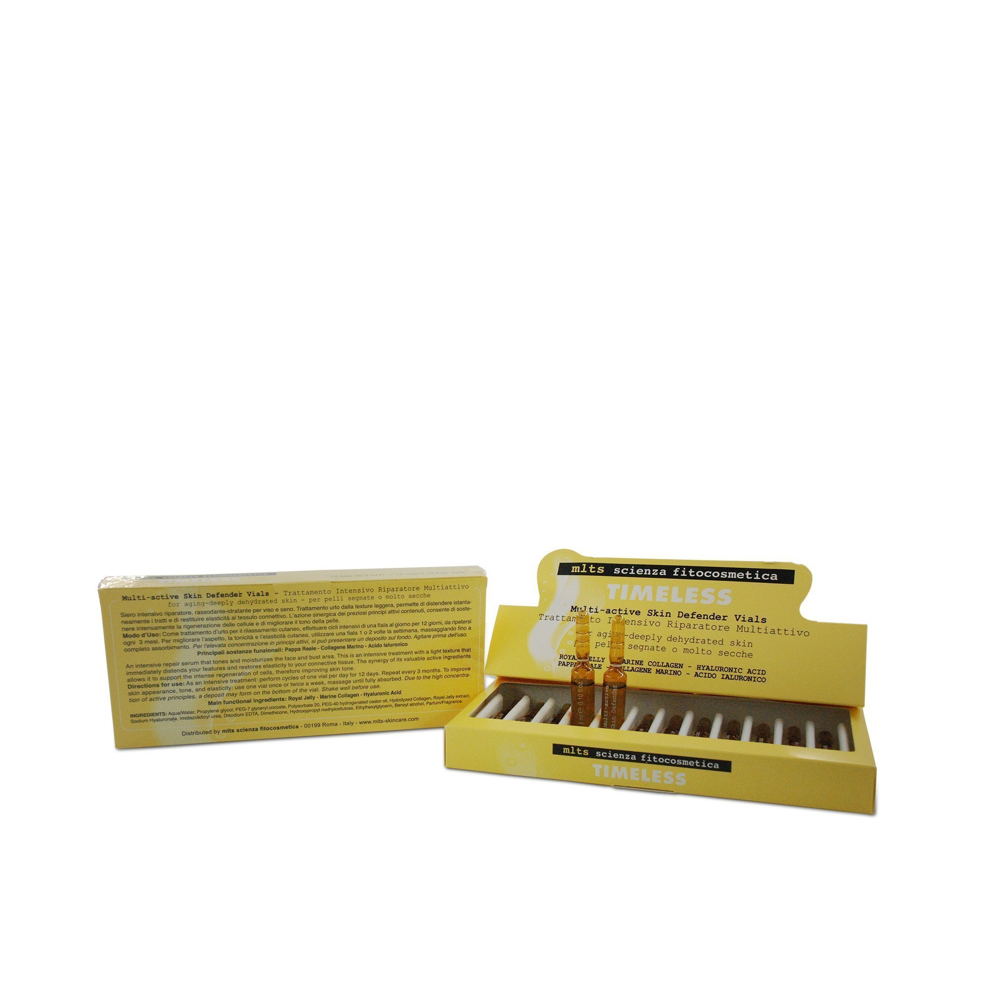 Modo d’uso: Come trattamento d’urto per il rilassamento cutaneo, effettuare cicli intensivi di una fiala al giorno per 12 giorni, da ripetersi ogni 3 mesi. Per migliorare l’aspetto, la tonicità e l’elasticità cutanea, utilizzare una fiala 1 o 2 volte la settimana, massaggiando fino a completo assorbimento. Per l’elevata concentrazione in principi attivi, si può presentare un deposito sul fondo. Agitare prima dell’uso.